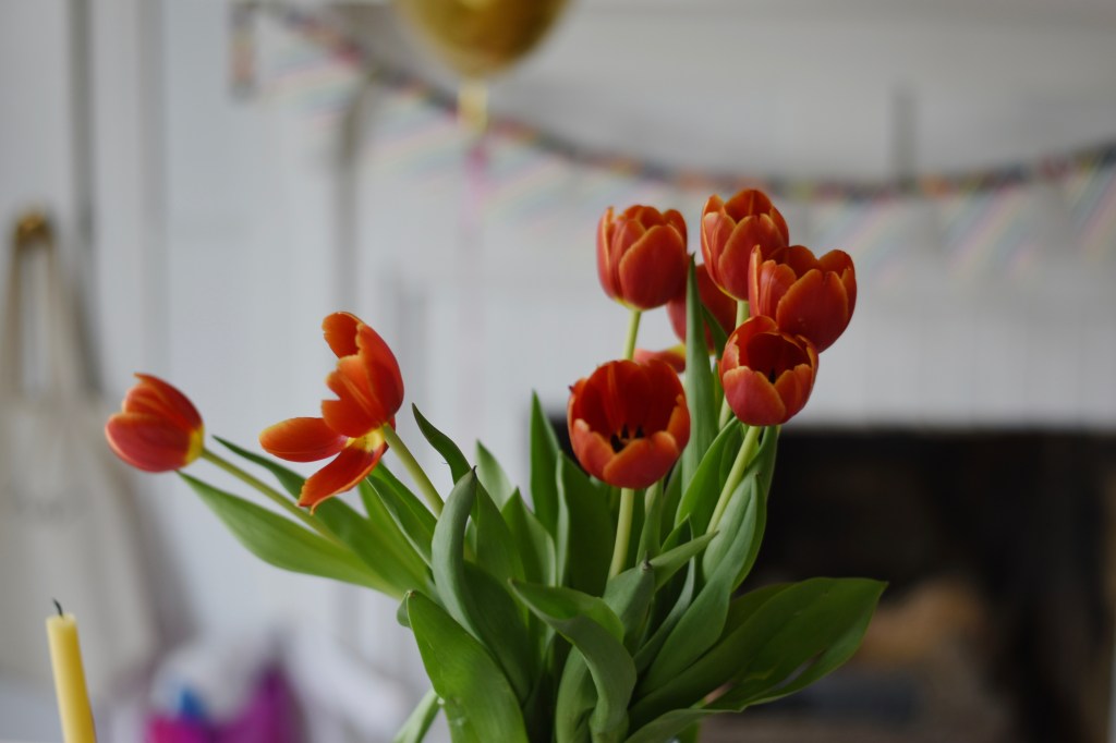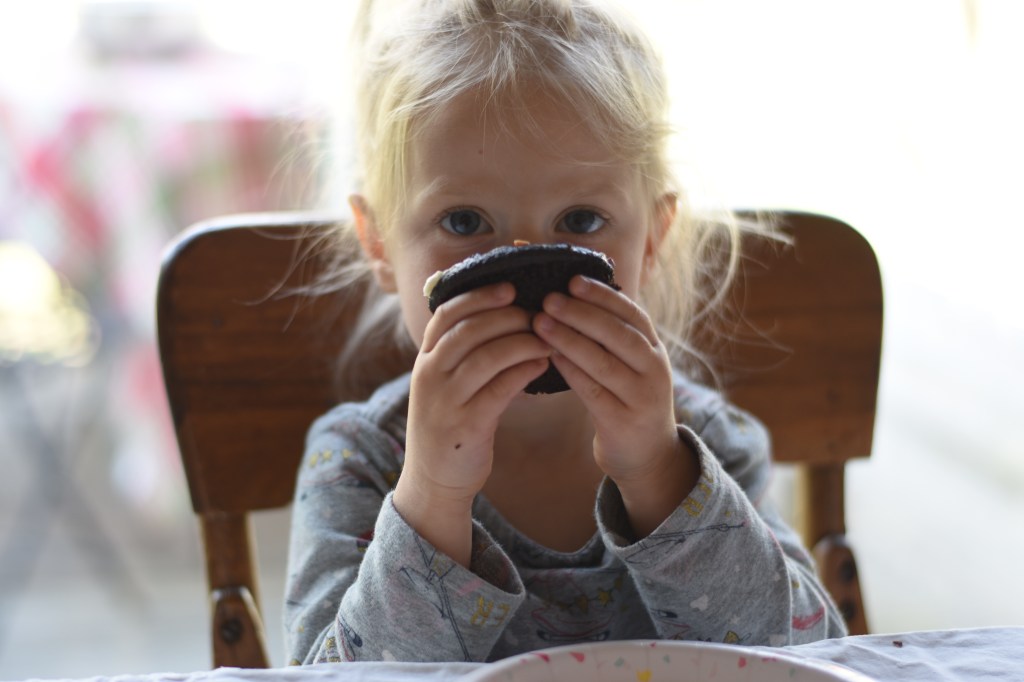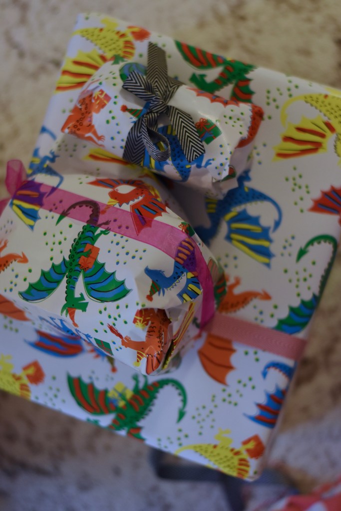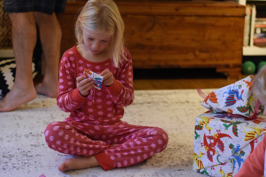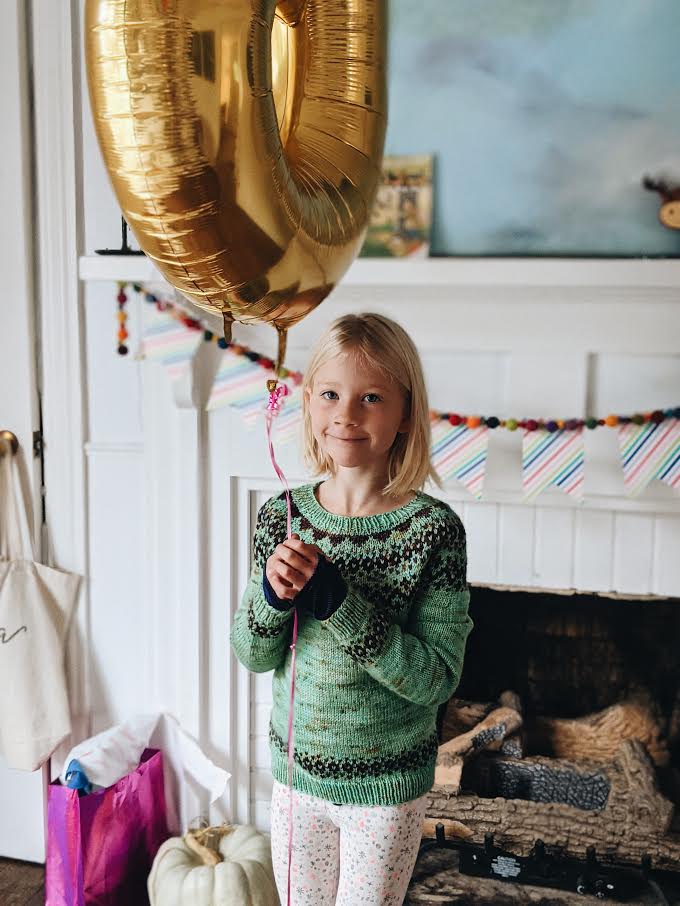 The next morning was her actual birthday and she requested her gifts be hidden around the house for her to find, which was great fun in the morning. We gifted her a few things she requested: a polaroid-type camera, a new dragon, a book of dragon stickers, her birthday sweater. As for her birthday sweater, she has worn it almost daily since her birthday. Success! It fits her well and she really seems to love it. I’m glad to finally have made her something that fits her taste. 🙂